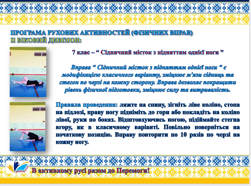 Кожен учасник на початку має представитись (прізвище, ім'я, навчальний заклад, клас), виконати рухову активність (фізичну вправу) витративши на це яку мого менше часу, знявши все на відео. По завершенню рухової активності додаються слова привітання на підтримку Збройних Сил України та всім Захисникам і Захисницям України (до десяти слів).